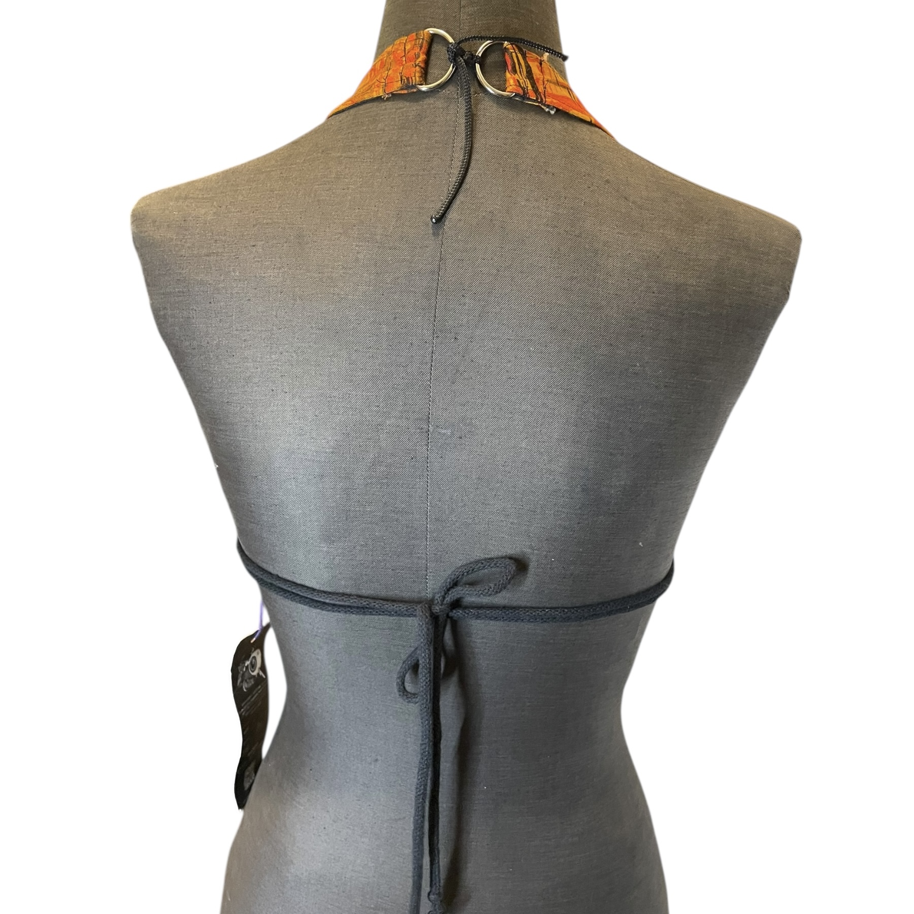 Tie up back, so it is adjustable.
