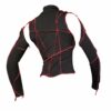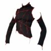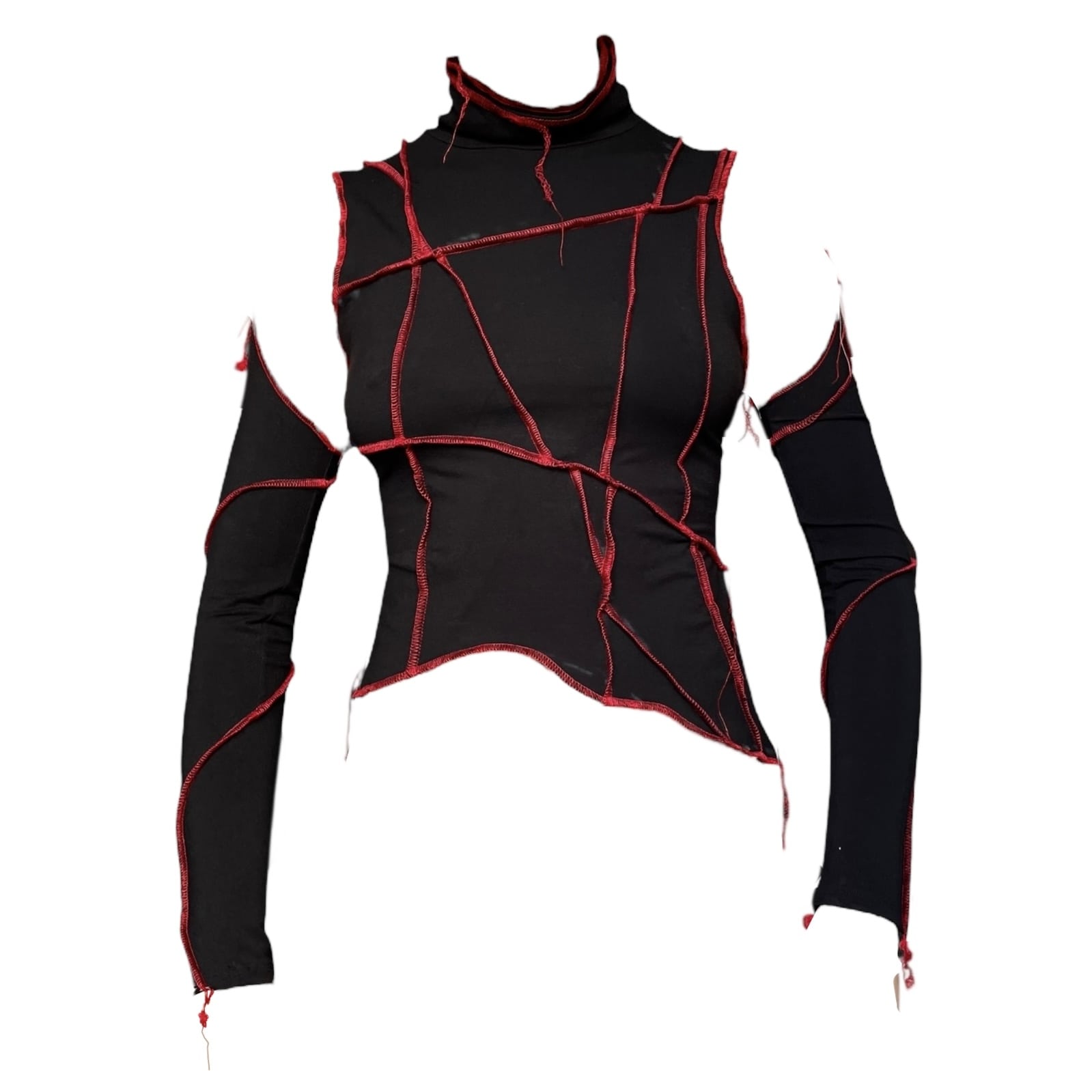 Upcycled black secondhand crop top, with red overlock details and asymmetric hem, complete with optional clip on sleeves. Stretch.