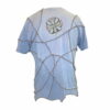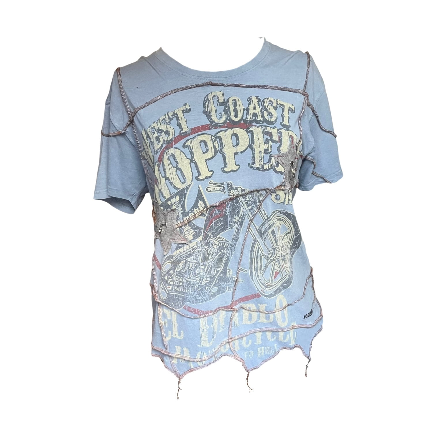 Upcycled tee, blue with brown stitch details and asymmetric hem.