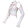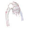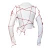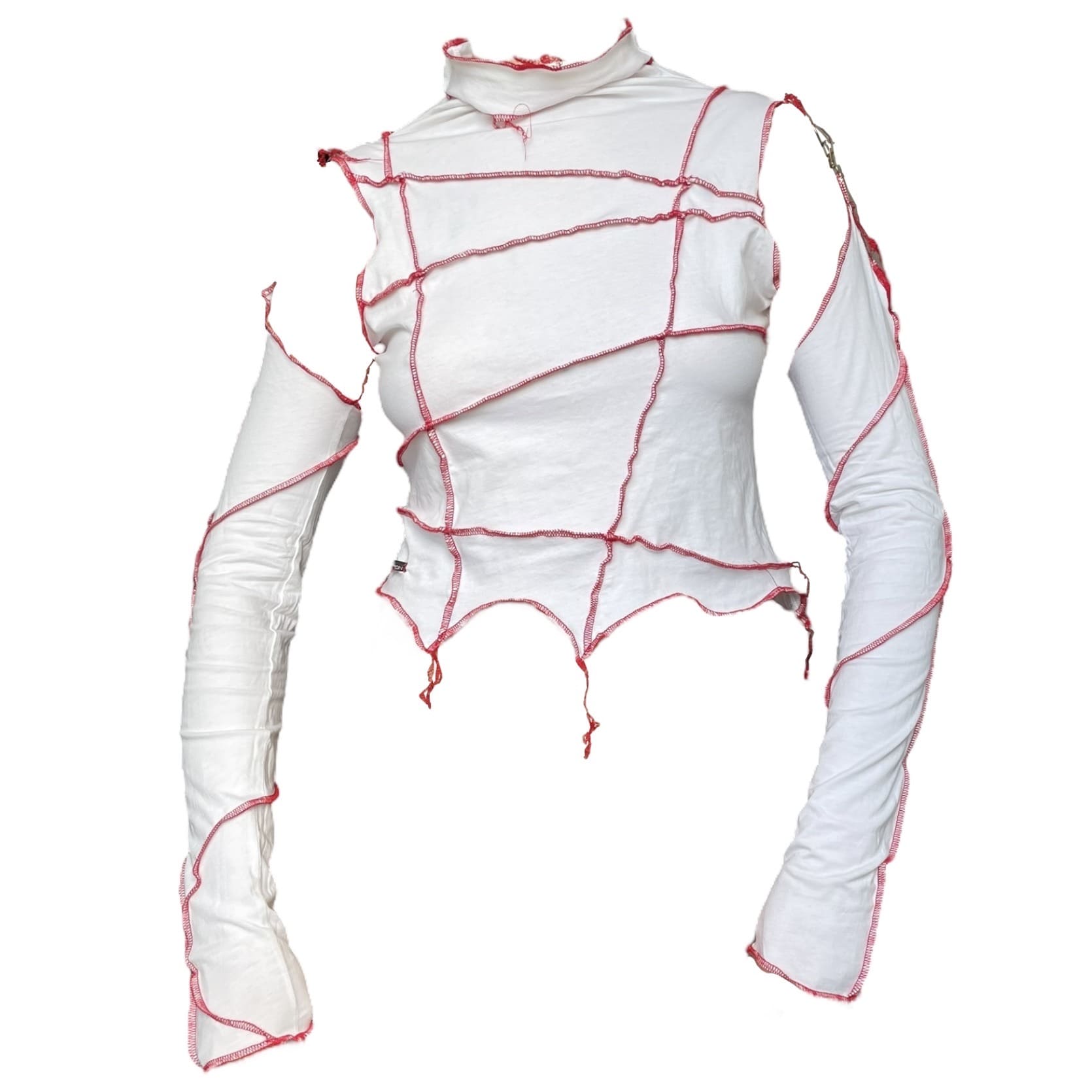 Upcycled white secondhand crop top, with red overlock details and asymmetric hem, complete with optional clip on sleeves. Super stretch fit.
